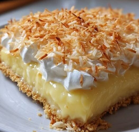 Espolvorea el coco tostado sobre la tarta ya fría. Cada cucharada de coco aporta crujido, aroma y un contraste visual encantador. Luego, corta en porciones y sirve. El primer bocado es un estallido de sabor: la acidez del limón se equilibra con la suavidad de la crema de coco, mientras que la corteza y el coco tostado añaden textura. Cada bocado es una pequeña celebración del sabor y la creatividad.